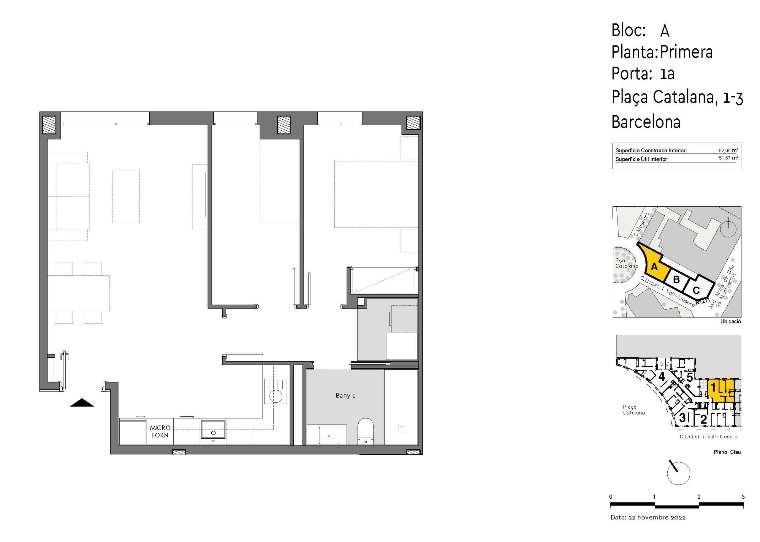 Проект, созданный архитектурной студией BCA Blanc + Cuenca Arquitectura, предлагает здание с округлым фасадом, повторяющем форму двух дорог его огибающих и площади Каталонии. На первых и подземных этажах расположены входы в вестибюли, технические помещения, двухуровневые пентхаусы, отделение для монтажа электрических счётчиков и коммерческое помещение. Этажи разной высоты предназначены для квартир разных размеров. Крыша плоская, с общими террасами с двумя неглубокими бассейнами, местами для общественных бельевых веревок и закрытыми площадями доступными только для обслуживания находящегося там частного и общественного оборудования. Доступ в подземные этажи для парковки автомобилей осуществляется через пандус с металлической дверью.